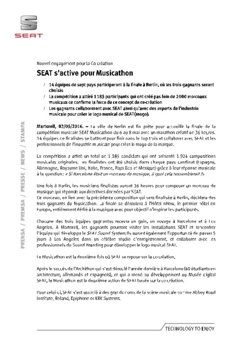 La ville de Berlin est fin prête pour accueillir la finale de la compétition musicale SEAT Musicathon du 6 au 8 mai avec un marathon créatif de 36 heures. 14 équipes de finalistes se battront pour finir dans le Top trois et collaborer avec SEAT et les professionnels de l’industrie musicale pour créer le Logo de la marque. La compétition a attiré un total de 1.185 candidats qui ont présenté 1.924 compositions musicales originales.