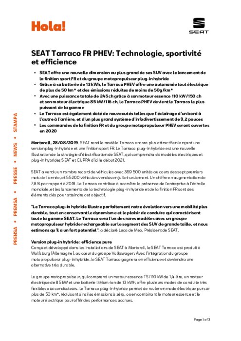SEAT rend le modèle Tarraco encore plus attractif en lançant une version plug-in hybride et une finition sport FR. Le Tarraco plug-in hybride est une nouvelle illustration de la stratégie d’électrification de SEAT, qui comprendra six modèles électriques et plug-in hybrides SEAT et CUPRA d’ici le début 2021.