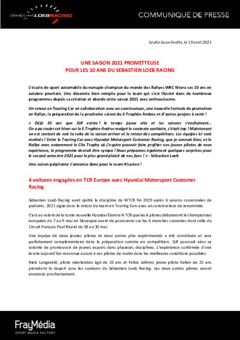 L'écurie de sport automobile du nonuple champion du monde des Rallyes WRC fêtera ses 10 ans en octobre prochain. Une décennie bien remplie pour le team qui s'est illustré dans de nombreux programmes depuis sa création et aborde cette saison 2021 avec enthousiasme. Un retour en Touring Car en collaboration avec un constructeur, une nouvelle formule de promotion en Rallye, la préparation de la prochaine saison du E-Trophée Andros et d'autres projets à venir !