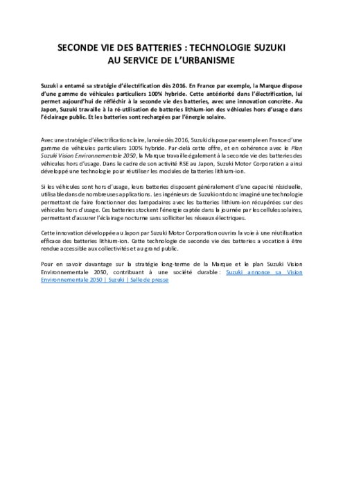 Suzuki a entamé sa stratégie d’électrification dès 2016. En France par exemple, la Marque dispose d’une gamme de véhicules particuliers 100% hybride. Cette antériorité dans l’électrification, lui permet aujourd’hui de réfléchir à la seconde vie des batteries, avec une innovation concrète. Au Japon, Suzuki travaille à la ré-utilisation de batteries lithium-ion des véhicules hors d’usage dans l’éclairage public. Et les batteries sont rechargées par l’énergie solaire.