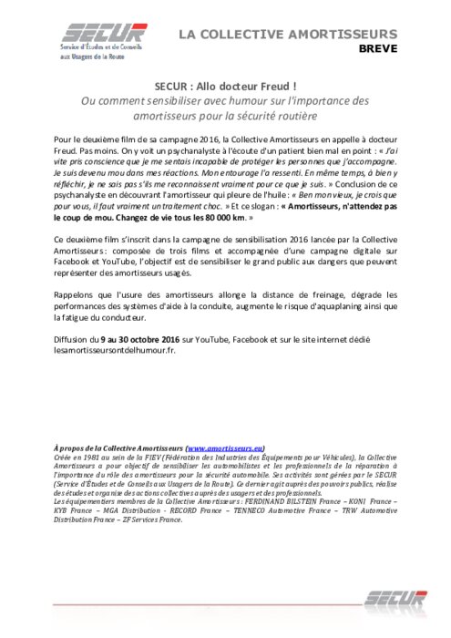 Pour le deuxième film de sa campagne 2016, la Collective Amortisseurs en appelle à docteur Freud. Pas moins. L’objectif est de sensibiliser le grand public aux dangers que peuvent représenter des amortisseurs usagés. Rappelons que l'usure des amortisseurs allonge la distance de freinage, dégrade les performances des systèmes d'aide à la conduite, augmente le risque d'aquaplaning ainsi que la fatigue du conducteur.