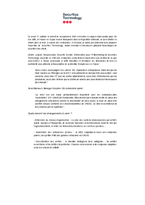 Cédric Lejault, Responsable Sécurité System Information pour IT Monitoring de Securitas Technology conseille en effet aux entreprises nouvellement concernées par la NIS2 de ne pas sous-estimer le temps nécessaire à cette transition et d'entamer les démarches de mise en conformité sans attendre la transcription de la directive Européenne en France.