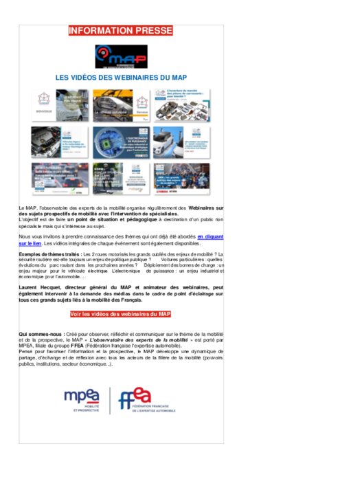 Services 01 février 2022 - 08:57 Le MAP, l’observatoire des experts de la mobilité organise régulièrement des Webinaires sur des sujets prospectifs de mobilité avec l’intervention de spécialistes. PDF (238 Ko) Télécharger