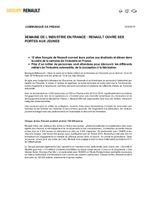 Dans le cadre de la 6ème édition de la Semaine de l’industrie qui se tient du 14 au 20 mars 2016 Renault ouvre les portes de 12 de ses sites français. En ligne avec l’objectif du Ministère de l’Economie, de l’Industrie et du Numérique de promouvoir l’attractivité des métiers de l’industrie, 9 usines, 2 centres de logistique, le centre technique de Lardy ainsi que le Technocentre, centre d’ingénierie à Guyancourt, vont faire découvrir aux élèves et étudiants les différents métiers de l’industrie.