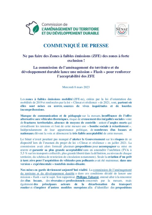 Les zones à faibles émissions mobilité (ZFE‑m), créées par la loi d’orientation des mobilités de 2019 et renforcées par la loi « Climat et résilience » de 2021, sont, partout où elles sont mises en œuvre, sources de vives inquiétudes et de lourdes incompréhensions.