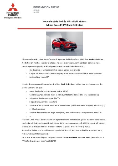 L’Eclipse Cross PHEV « Black Collection » reprend la même motorisation que les autres finitions avec sa technologie hybride rechargeable Twin Motor 4WD : un moteur essence 2.4 MIVEC couplé à 2 moteurs électriques et 4 roues motrices alliées au système Super-All Wheel Control (S-AWC). Cette série limitée est disponible dans cinq coloris (Diamond Red, Diamond White, Amethyst Black, Titanium Grey et Sterling Silver).
