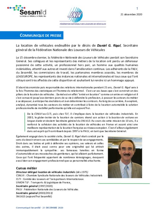 Services 22 décembre 2020 - 19:45 La location de véhicules endeuillée par le décès de Daniel G. Rigal, Secrétaire général de la Fédération Nationale des Loueurs de Véhicules. PDF (293 Ko) Télécharger