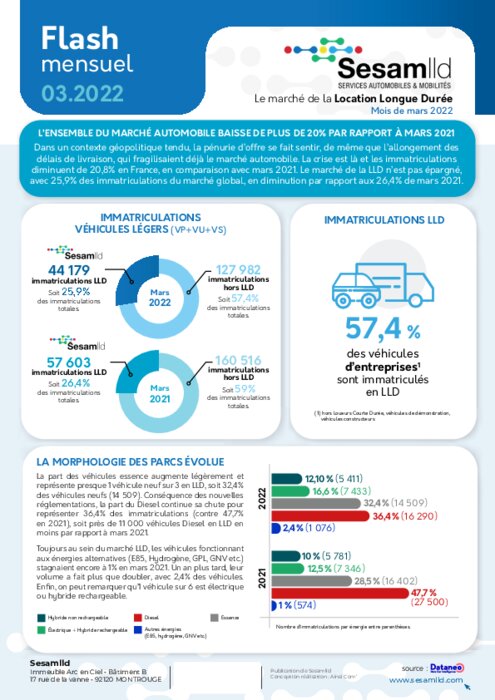 Dans un contexte géopolitique tendu, la pénurie d’offre se fait sentir, de même que l’allongement des délais de livraison, qui fragilisaient déjà le marché automobile. La crise est là et les immatriculations diminuent de 20,8% en France, en comparaison avec mars 2021. Le marché de la LLD n’est pas épargné, avec 25,9% des immatriculations du marché global, en diminution par rapport aux 26,4% de mars 2021.
