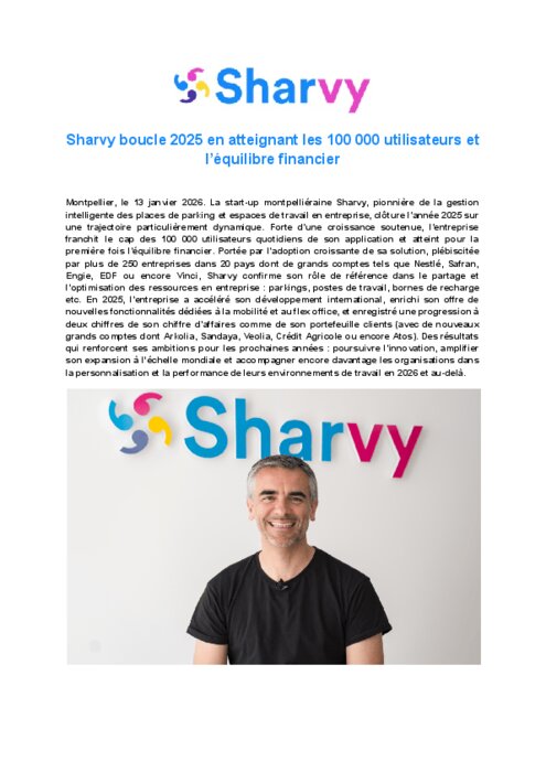 Lancée en 2018 à Montpellier par Stéphane Seigneurin, ingénieur en électronique et informatique, Sharvy est née avec l’ambition de révolutionner la gestion des places de parking en entreprisegrâce à une solution SaaS intuitive, accessible sur mobile et web. Son algorithme d’attribution, pensé pour garantir l’équité entre collaborateurs, a rapidement séduit, poussant la start-up, alors nommée MyCarSpot, à élargir son périmètre aux bornes de recharge, postes de travail, espaces de restauration et de nombreuses autres ressources. Cette évolution s’est accélérée avec la transformation profonde des organisations post-Covid, où télétravail, flex office et espaces collaboratifs nécessitent une gestion optimisée et centralisée afin de mieux utiliser les ressources des entreprises et de leur permettre de réduire leurs coûts. Aujourd’hui, la mission de Sharvy est de faciliter la mobilité des salariés et l’usage intelligent de toutes les ressources en entreprise, contribuant ainsi à la fois au bien-être des collaborateurs et à la performance des organisations.