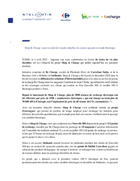 Apporter une vraie contribution en faveur de styles de vie plus durables: tel est l’objectif du projet Shop & Charge qui publie aujourd’hui ses premiers résultats. Initiative conjointe de Be Charge, société de Plenitude (Eni), de Carrefour Italia, et de la Business Unit e-Mobility de Stellantis, Shop & Charge a été lancée en décembre 2020 dans le but de favoriser la diffusion des solutions d’électromobilité grâce à la mise en service de points de recharge Be Charge dans les magasins Carrefour...
