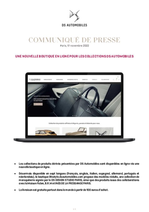 Les collections de produits dérivés présentées par DS Automobiles sont disponibles en ligne via une nouvelle boutique en ligne. Désormais disponible en sept langues (français, anglais, italien, espagnol, allemand, portugais et néerlandais), la boutique lifestyle.dsautomobiles.com propose des modèles réduits, une collection de maroquinerie signée par le DS DESIGN STUDIO PARIS, ainsi que des produits issus des collaborations avec la Maison Fabre, B.R.M et INES DE LA FRESSANGE PARIS.