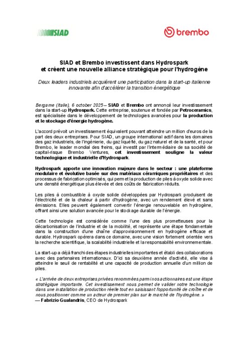 Equipementiers 06 octobre 2025 - 11:40 SIAD et Brembo ont annoncé leur investissement dans la start-up Hydrospark. Cette entreprise, soutenue et fondée par Petroceramics, est spécialisée dans le développement de technologies avancées pour la production et le stockage d'énergie hydrogène. PDF (262 Ko) Télécharger © Brembo