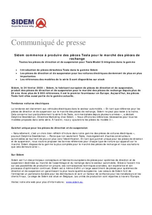 Sidem, le fabricant européen de pièces de direction et de suspension, produit des pièces de direction et de suspension pour le marché des pièces de rechange depuis plus de 85 ans. Avec plus de 9 000 références, il est le premier fournisseur en Europe. Aujourd’hui, les pièces Tesla font elles aussi partie de la gamme actuelle.