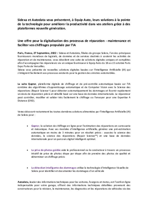 Sidexa et Autodata, filiales du groupe Solera, l'un des principaux fournisseurs mondiaux de logiciels, de données et de services destinés à soutenir les activités de réparation et de maintenance, vous dévoilent une suite de solutions digitales uniques et complètes afin d’accompagner les réparateurs via un unique fournisseur à Equip Auto du 18 au 22 octobre Paris Expo Porte de Versailles.