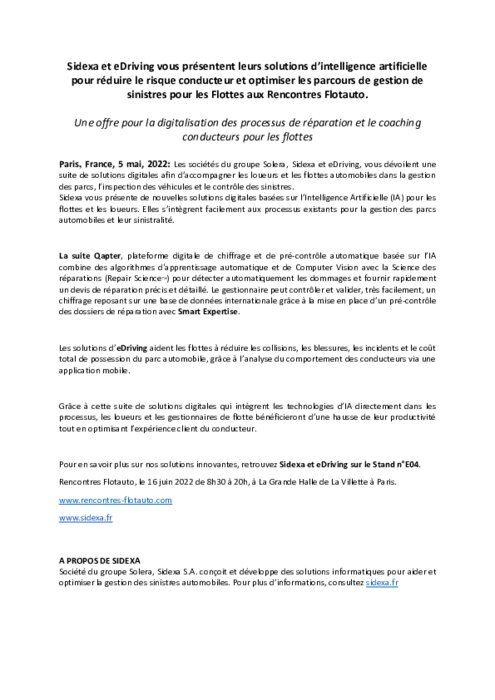Les sociétés du groupe Solera, Sidexa et eDriving, vous dévoilent une suite de solutions digitales afin d’accompagner les loueurs et les flottes automobiles dans la gestion des parcs, l’inspection des véhicules et le contrôle des sinistres. Sidexa vous présente de nouvelles solutions digitales basées sur l’Intelligence Artificielle (IA) pour les flottes et les loueurs. Elles s’intègrent facilement aux processus existants pour la gestion des parcs automobiles et leur sinistralité.