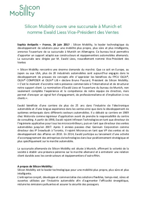 Silicon Mobility, le leader technologique du développement de solutions pour une mobilité plus propre, plus sûre et plus intelligente, annonce l'ouverture de sa succursale à Munich en Allemagne. Ce bureau local permettra d'apporter un support adapté aux constructeurs et équipementiers automobiles allemands. La succursale sera dirigée par M. Ewald Liess, nouvellement nommé Vice-Président des Ventes.