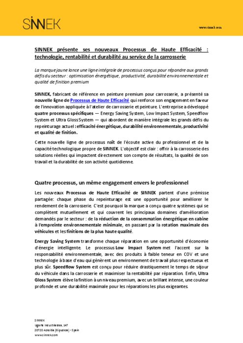 Equipementiers 18 février 2026 - 15:40 La marque jaune lance une ligne intégrale de processus conçus pour répondre aux grands défis du secteur : optimisation énergétique, productivité, durabilité environnementale et qualité de finition premium. PDF (211 Ko) Télécharger credit Sinnek