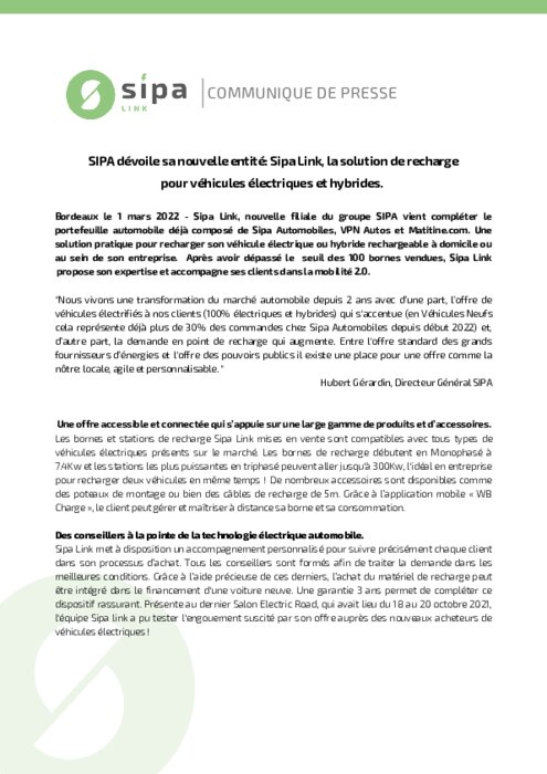 Sipa Link, nouvelle filiale du groupe SIPA vient compléter le portefeuille automobile déjà composé de Sipa Automobiles, VPN Autos et Matitine.com. Une solution pratique pour recharger son véhicule électrique ou hybride rechargeable à domicile ou au sein de son entreprise. Après avoir dépassé le seuil des 100 bornes vendues, Sipa Link propose son expertise et accompagne ses clients dans la mobilité 2.0