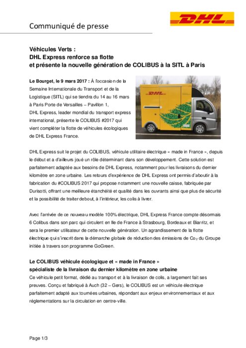 À l’occasion de la Semaine Internationale du Transport et de la Logistique (SITL) qui se tiendra du 14 au 16 mars à Paris Porte de Versailles – Pavillon 1, DHL Express, leader mondial du transport express international, présente le COLIBUS #2017 qui vient compléter la flotte de véhicules écologiques de DHL Express France. DHL Express suit le projet du COLIBUS, véhicule utilitaire électrique « made in France », depuis le début et a d’ailleurs joué un rôle déterminant dans son développement.