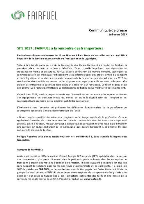 Services 09 mars 2017 - 11:23 Fairfuel vous donne rendez-vous du 14 au 16 mars à Paris Porte de Versailles sur le stand R60 à l'occasion de la Semaine Internationale du Transport et de la Logistique. PDF (164 Ko) Télécharger