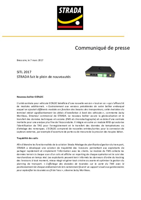 Services 08 mars 2017 - 17:20 A l'occasion de la SITL, STRADA dévoile 3 nouveautés en matière de suivi des livraisons, de gestion sociale et de remontée des températures par RFID, toutes issues d'une nouvelle génération de matériels à la pointe de l'innovation. PDF (229 Ko) Télécharger