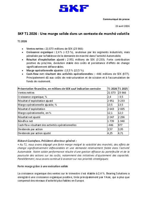 La croissance organique des ventes sur le trimestre s’est établie à 2,4 %. Bearing Solutions a enregistré une croissance organique positive, tirée principalement par l’Asie, qui a plus que compensé des niveaux d’activité plus faibles en Europe. La poursuite d’une forte croissance organique au sein de Specialized Industrial Solutions (SIS) a été portée par les activités Aerospace et Magnetic Solutions. Cela a compensé une demande toujours atone dans l’activité Automobile, à l’exception des produits de rechange.