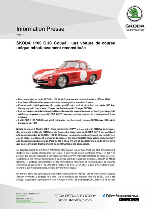 Pour marquer le 120ème anniversaire de ŠKODA Motorsport, des employés du Musée ŠKODA et du Centre des prototypes de ŠKODA AUTO ont collaboré afin de reconstruire la ŠKODA 1100 OHC Coupé. Les équipes ont commencé par remettre en état le cadre, le châssis et le moteur d'origine et ont reconstruit la carrosserie conformément à la documentation historique. Pour ce faire, elles ont utilisé des technologies de pointe ainsi que des techniques traditionnelles de construction de la carrosserie.