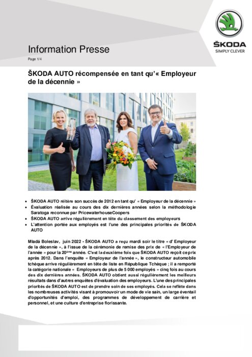 ŠKODA AUTO a reçu mardi soir le titre « d' Employeur de la décennie », à l'issue de la cérémonie de remise des prix de « l'Employeur de l'année » pour la 20ème année. C'est la deuxième fois que ŠKODA AUTO reçoit ce prix après 2012. Dans l'enquête « Employeur de l'année », le constructeur automobile tchèque arrive régulièrement en tête de liste en République Tchèque ; il a remporté la catégorie nationale « Employeurs de plus de 5 000 employés » cinq fois au cours des dix dernières années.