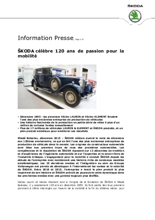 ŠKODA célèbre durant le mois de décembre son 120ème anniversaire, ce qui en fait l’une des plus anciennes entreprises de production de véhicule dans le monde. Les origines du constructeur automobile sont liées aux premiers tours de roue des premières automobiles. Les compétences et la réputation de ŠKODA reposent sur 12 décennies de tradition et d’expérience de l’ingénierie automobile et sur l’expertise et le savoir-faire de l’industrie tchèque.