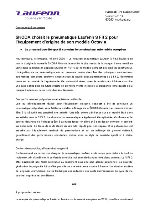 Le nouveau pneumatique Laufenn S Fit 2 équipera en monte d’origine la nouvelle Škoda Octavia, le modèle le plus vendu de la marque. Il sera monté en usine dans la dimension populaire 205/55 R17 91 V sur le modèle compact très prisé du constructeur. L’intégration de ce pneumatique été en première monte chez l'un des principaux constructeurs automobiles européens confirme le haut niveau de qualité et les performances du S Fit 2, récemment lancé sur le marché de l’après-vente. Ce partenariat réussi avec le constructeur tchèque constitue une base solide pour de futurs projets en première monte et illustre la croissance remarquable de la marque Laufenn au cours de la dernière décennie.