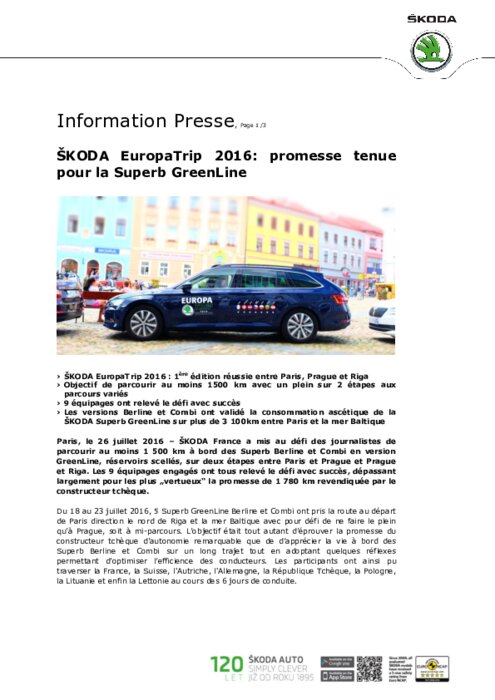 ŠKODA France a mis au défi des journalistes de parcourir au moins 1 500 km à bord des Superb Berline et Combi en version GreenLine, réservoirs scellés, sur deux étapes entre Paris et Prague et Prague et Riga. Les 9 équipages engagés ont tous relevé le défi avec succès, dépassant largement pour les plus " vertueux " la promesse de 1 780 km revendiquée par le constructeur tchèque.