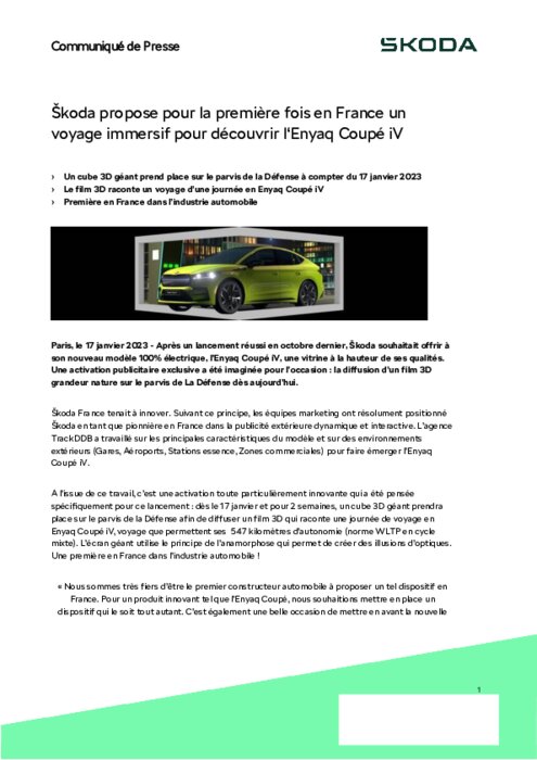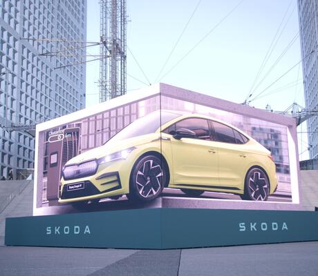 Après un lancement réussi en octobre dernier, Škoda souhaitait offrir à son nouveau modèle 100% électrique, l’Enyaq Coupé iV, une vitrine à la hauteur de ses qualités. Une activation publicitaire exclusive a été imaginée pour l’occasion : la diffusion d’un film 3D grandeur nature sur le parvis de La Défense dès aujourd’hui.
