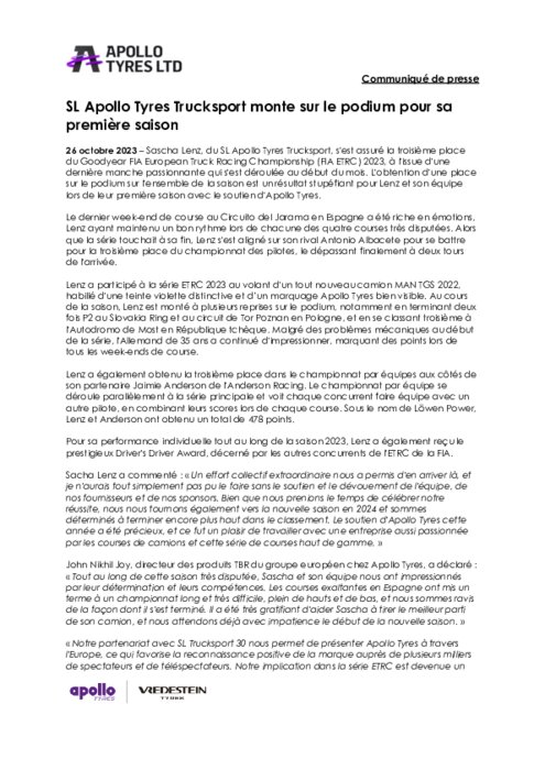 Sascha Lenz, du SL Apollo Tyres Trucksport, s'est assuré la troisième place du Goodyear FIA European Truck Racing Championship (FIA ETRC) 2023, à l'issue d'une dernière manche passionnante. L'obtention d'une place sur le podium sur l'ensemble de la saison est un résultat stupéfiant pour Lenz et son équipe lors de leur première saison avec le soutien d'Apollo Tyres.