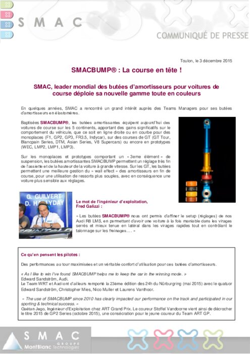 En quelques années, SMAC a rencontré un grand intérêt auprès des Teams Managers pour ses butées d’amortisseurs en élastomères. Baptisées SMACBUMP, les butées amortissantes équipent aujourd’hui des voitures de course sur les 5 continents, apportant des gains significatifs sur le comportement du véhicule, que ce soit en ligne droite ou en courbe pour des monoplaces (F1, GP2, GP3, FR3.5, Indycar) et sur des courses de GT (GT Tour, Blancpain Series, DTM, Asian Series, V8 Supercars).