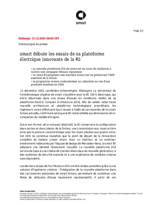 La réinvention de l’emblématique citadine de smart s’accélère avec la #2 100 % électrique, qui entre désormais dans une phase d’essais en conditions réelles de sa plateforme Electric Compact Architecture (ECA). Afin de valider cette toute nouvelle architecture et plateforme technologique propriétaire, les ingénieurs smart effectuent leurs essais à l’aide de carrosseries de la smart fortwo actuelle, confirmant ainsi que la #2 restera fidèle aux dimensions ultra-compactes du modèle d’origine.