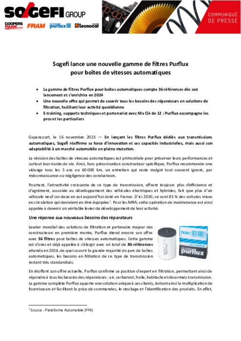 Equipementiers 21 novembre 2023 - 09:21 En lançant les filtres Purflux dédiés aux transmissions automatiques, Sogefi réaffirme sa force d’innovation et ses capacités industrielles, mais aussi son adaptabilité à un marché automobile en pleine mutation. PDF (328 Ko) Télécharger