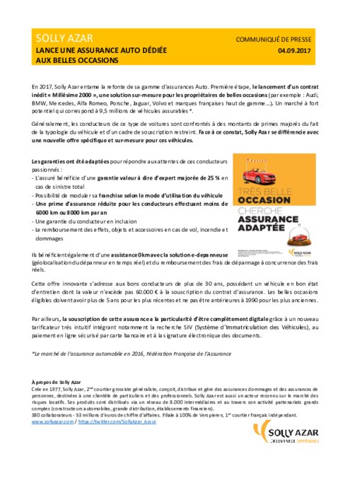 En 2017, Solly Azar entame la refonte de sa gamme d'assurances Auto. Première étape, le lancement d'un contrat inédit " Millésime 2000 ", une solution sur-mesure pour les propriétaires de belles occasions (par exemple : Audi, BMW, Mercedes, Alfa Romeo, Porsche, Jaguar, Volvo et marques françaises haut de gamme...). Un marché à fort potentiel qui correspond à 9,5 millions de véhicules assurables.