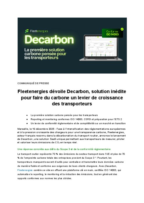 Face à l’intensification des réglementations européennes et à la pression croissante des chargeurs pour une transparence carbone, Fleetenergies, acteur français reconnu dans la décarbonation du transport routier, annonce le lancement de Decarbon, une solution SaaS unique permettant aux transporteurs de mesurer, piloter et valoriser leurs émissions de CO₂ en temps réel.