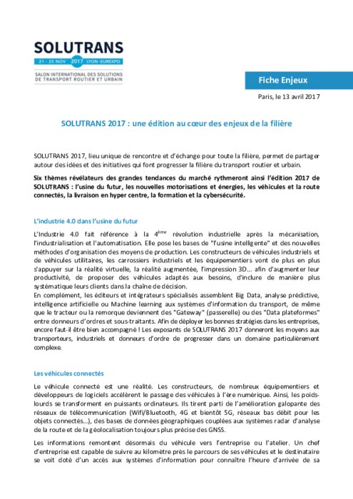 SOLUTRANS 2017, lieu unique de rencontre et d’échange pour toute la filifre, permet de partager autour des idées et des initiatives qui font progresser la filière du transport routier et urbain. Six thèmes révélateurs des grandes tendances du marché rythmeront ainsi l’édition 2017 de SOLUTRANS : l’usine du futur, les nouvelles motorisations et énergies, les véhicules et la route connectés, la livraison en hyper centre, la formation et la cybersécurité.