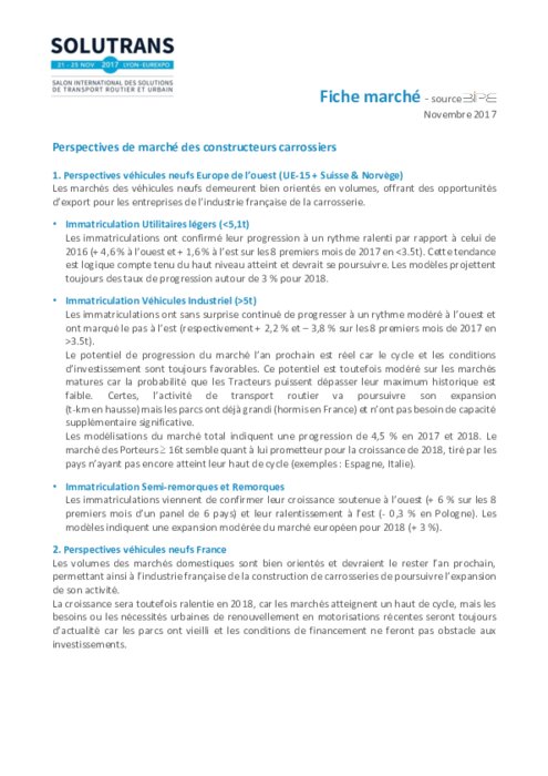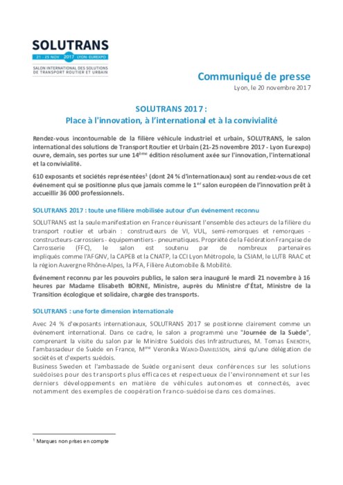 Rendez-vous incontournable de la filière véhicule industriel et urbain, SOLUTRANS, le salon international des solutions de Transport Routier et Urbain (21-25 novembre 2017 - Lyon Eurexpo) ouvre, ses portes sur une 14ème édition résolument axée sur l'innovation, l'international et la convivialité. 610 exposants et sociétés représentées (dont 24 % d'internationaux) sont au rendez-vous de cet événement qui se positionne plus que jamais comme le 1er salon européen de l'innovation.