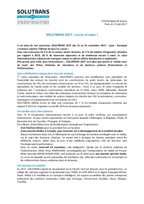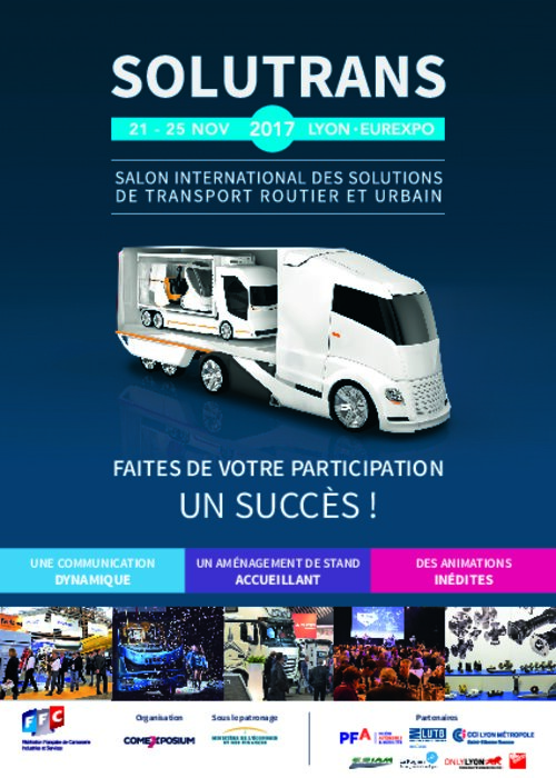 Plus grand, plus riche, plus international…, SOLUTRANS 2017 sera plus que jamais le rendez-vous de toute une filière, initiateur de rencontres et de business, porteur d'innovations et d'informations. Parallèlement, la Fédération Française de Carrosserie et Comexposium, organisateur du Salon, viennent d'éditer un livret destiné aux exposants de SOLUTRANS, une sorte de mémo des indispensables, des fondamentaux à ne pas oublier pour faire de sa présence un succès.