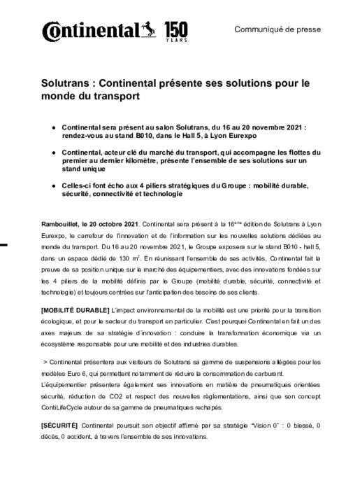 Continental sera présent à la 16ème édition de Solutrans à Lyon Eurexpo, le carrefour de l'innovation et de l'information sur les nouvelles solutions dédiées au monde du transport. Du 16 au 20 novembre 2021, le Groupe exposera sur le stand B010 - hall 5, dans un espace dédié de 130 m2. En réunissant l'ensemble de ses activités, Continental fait la preuve de sa position unique sur le marché des équipementiers, avec des innovations fondées sur les 4 piliers de la mobilité définis par le Groupe...