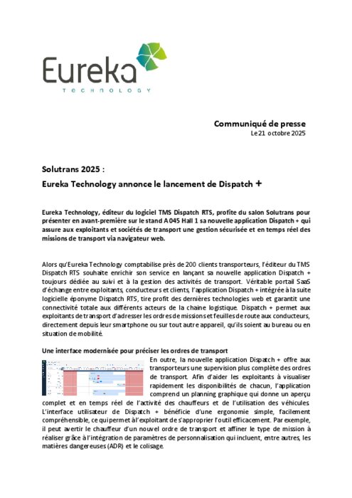 Alors qu’Eureka Technology comptabilise près de 200 clients transporteurs, l’éditeur du TMS DispatchRTS souhaite enrichir son serviceen lançant sa nouvelle applicationDispatch +toujours dédiéeau suivi et à la gestion des activités de transport.Véritable portail SaaS d’échange entre exploitants, conducteurset clients, l’applicationDispatch+intégrée à la suite logicielle éponyme Dispatch RTS, tireprofit desdernières technologies web et garantit une connectivité totale auxdifférents acteurs de la chaine logistique. Dispatch +permet aux exploitants de transport d’adresser les ordres de missions et feuilles de route aux conducteurs, directement depuis leur smartphoneousurtout autre appareil,qu’ils soient au bureau ou en situation de mobilité.