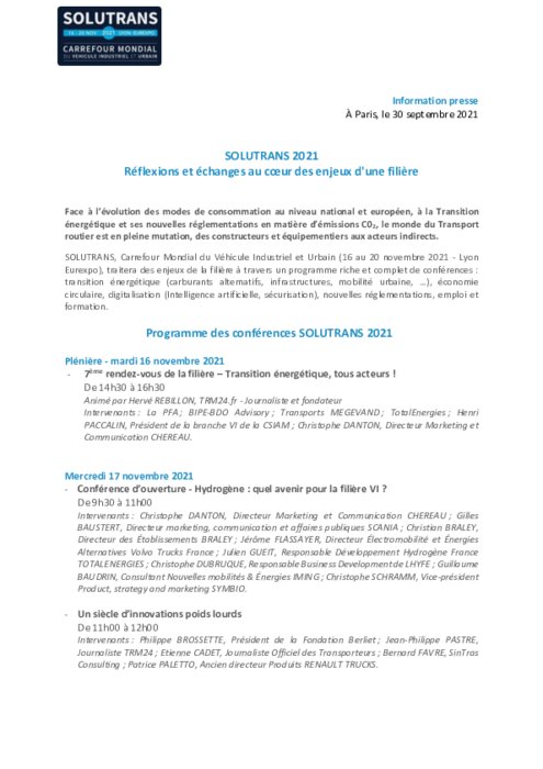 SOLUTRANS, Carrefour Mondial du Véhicule Industriel et Urbain (16 au 20 novembre 2021 - Lyon Eurexpo), traitera des enjeux de la filière à travers un programme riche et complet de conférences : transition énergétique (carburants alternatifs, infrastructures, mobilité urbaine, …), économie circulaire, digitalisation (Intelligence artificielle, sécurisation), nouvelles réglementations, emploi et formation.
