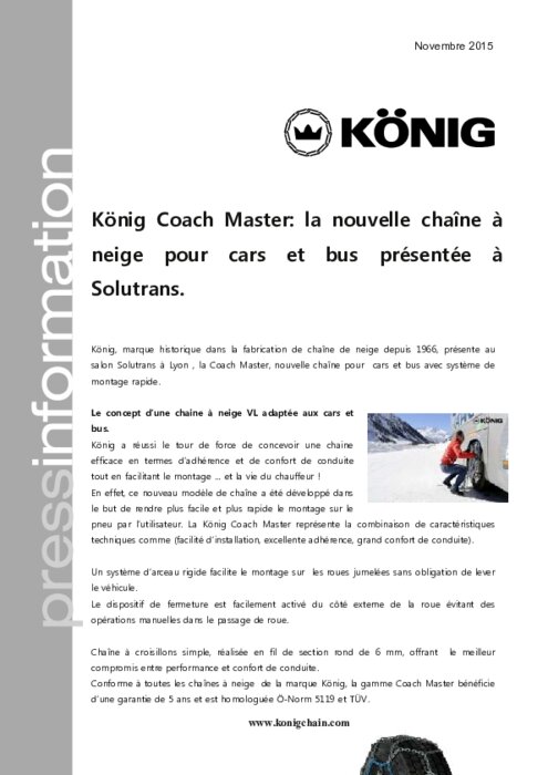 König, marque historique dans la fabrication de chaîne de neige depuis 1966, présente au salon Solutrans à Lyon , la Coach Master, nouvelle chaîne pour cars et bus avec système de montage rapide.