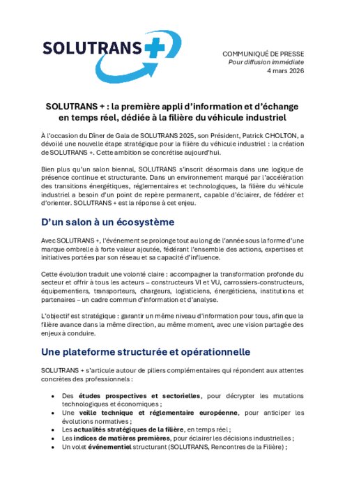 Bien plus qu’un salon biennal, SOLUTRANS s’inscrit désormais dans une logique de présence continue et structurante. Dans un environnement marqué par l’accélération des transitions énergétiques, réglementaires et technologiques, la filière du véhicule industriel a besoin d’un point de repère permanent, capable d’éclairer, de fédérer et d’orienter. SOLUTRANS + est la réponse à cet enjeu.