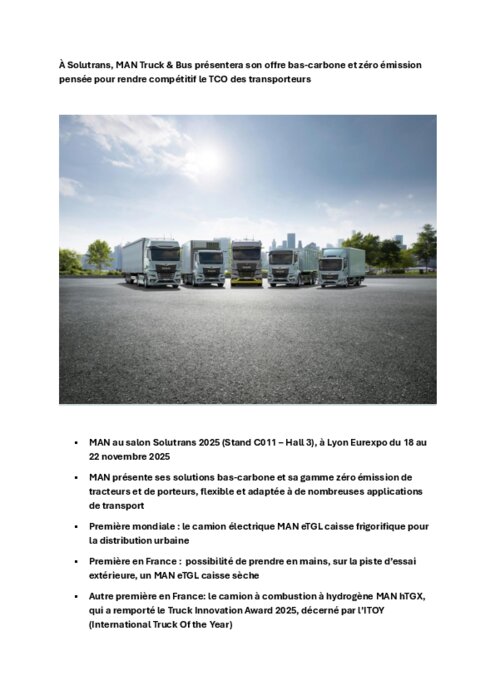 Cette édition 2025 de Solutrans à Lyon Eurexpo du 18 au 22 novembre sera l’occasion pour MAN de faire un focus sur les énergies bas-carbone, ses solutions performantes pour un transport routier de marchandises décarboné et compétitif, et son retour d’expérience sur l’exploitation de ses véhicules électriques en Europe.