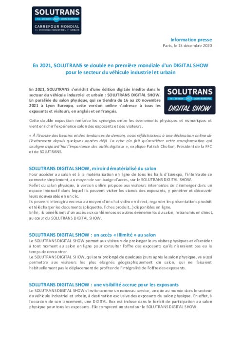 En 2021, SOLUTRANS s’enrichit d’une édition digitale inédite dans le secteur du véhicule industriel et urbain : SOLUTRANS DIGITAL SHOW. En parallèle du salon physique, qui se tiendra du 16 au 20 novembre 2021 à Lyon Eurexpo, cette version online s’adresse à tous les exposants et visiteurs, en anglais et en français.