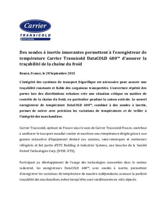 Equipementiers 28 septembre 2015 - 16:01 Le nouvel enregistreur de température DataCOLD 600, combiné à des sondes à inertie, permet de suivre avec précision les variations de températures et de veiller à l’intégrité des marchandises. PDF (88 Ko) Télécharger