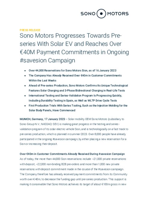 L'équipementier de la mobilité solaire Sono Motors fait de grands progrès dans le programme d'essai et de validation en série de son véhicule électrique solaire Sion, et est technologiquement sur la voie rapide de la production en présérie, qui est prévue pour l'été 2023. Plus de 8 000 personnes ont déjà participé à la campagne #savesion en cours, en effectuant une nouvelle réservation pour une Sion ou en augmentant leur dépôt.